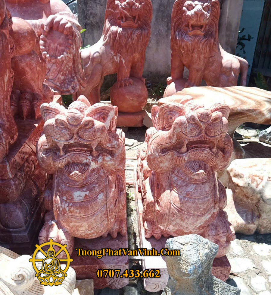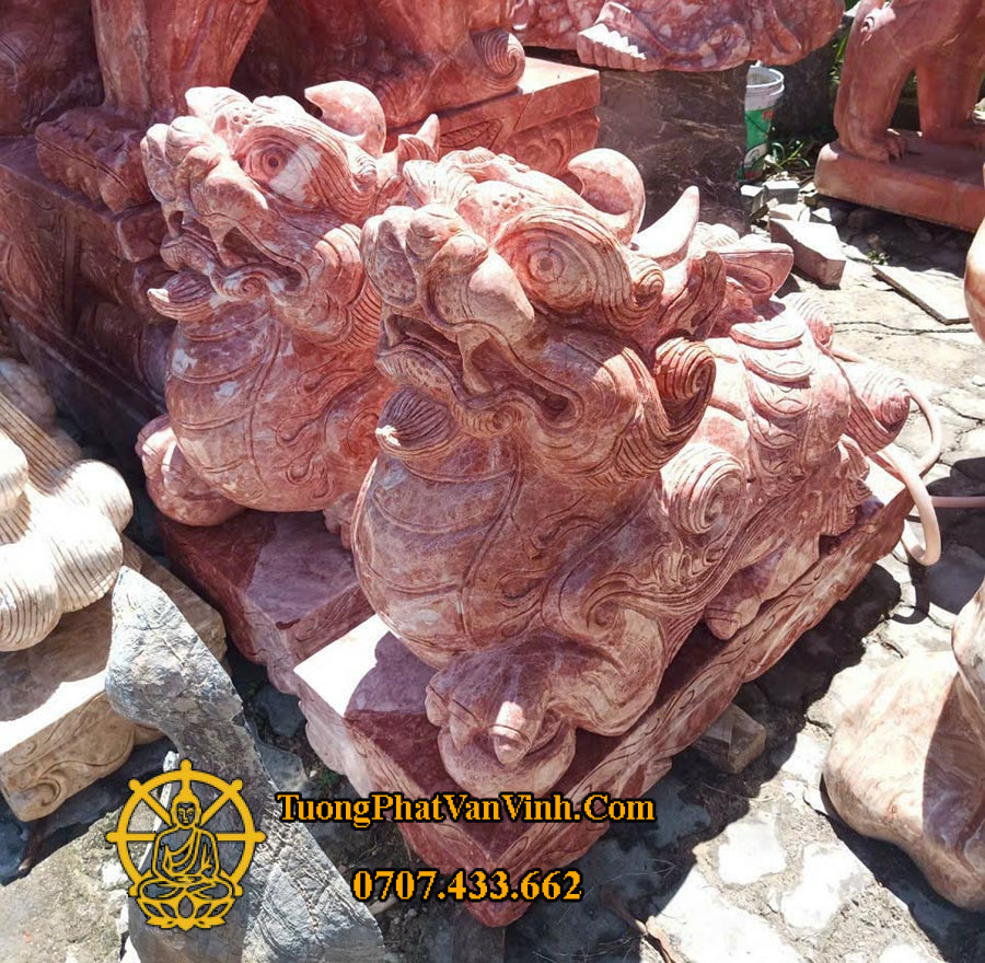 Cặp Tượng Tỳ hưu bằng đá đỏ dài 60 cm được chế tác thủ công tinh xảo tại xưởng điêu khắc Tượng Phật Văn Vĩnh, mang vẻ đẹp vừa uy nghiêm vừa sang trọng. Chất liệu đá đỏ tự nhiên nổi bật với gam màu ấm áp, rực rỡ, tượng trưng cho may mắn, quyền lực và năng lượng tích cực trong phong thủy.