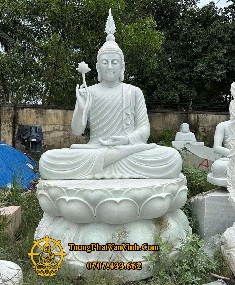 Tư thế ngồi thiền trên đài sen: Tượng mô tả Đức Phật Thích Ca đang ngồi kiết già trên đài sen – biểu tượng của sự thanh tịnh và giác ngộ. Một tay Ngài cầm bông sen, tay còn lại đặt nhẹ trên đùi, toát lên thần thái an nhiên, thấu triệt chân lý.